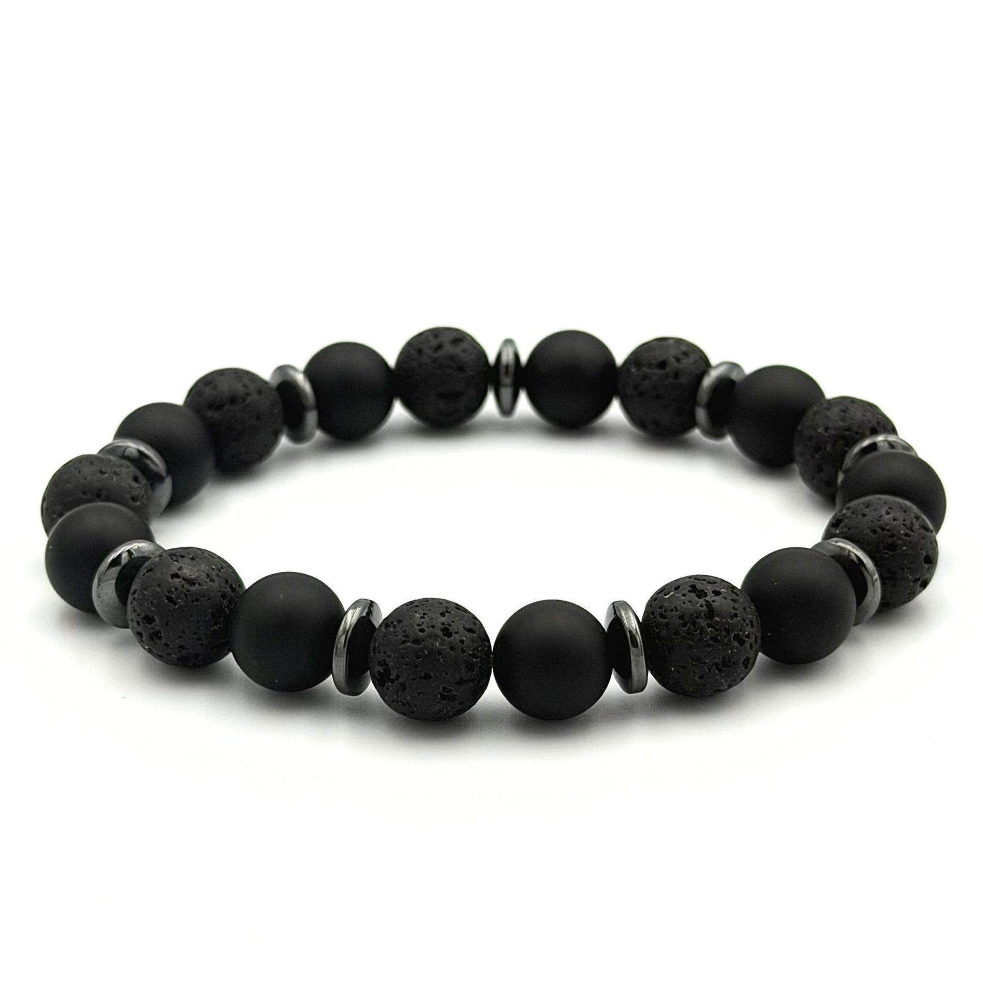 Add a bold, modern edge to your look with our Black Onyx & Lava Beaded Bracelet — a sleek natural gemstone bracelet that pairs the smooth matte finish of Black Onyx with the raw, textured surface of Black Lava. Available in 8mm or 10mm bead sizes, this unisex bracelet features coordinating onyx spacer accents that enhance its clean, monochrome aesthetic. Often associated with grounding, focus, and inner resilience, this piece blends contemporary minimalist design with a strong, understated presence — making it an effortless staple for everyday style or layered bracelet stacks.