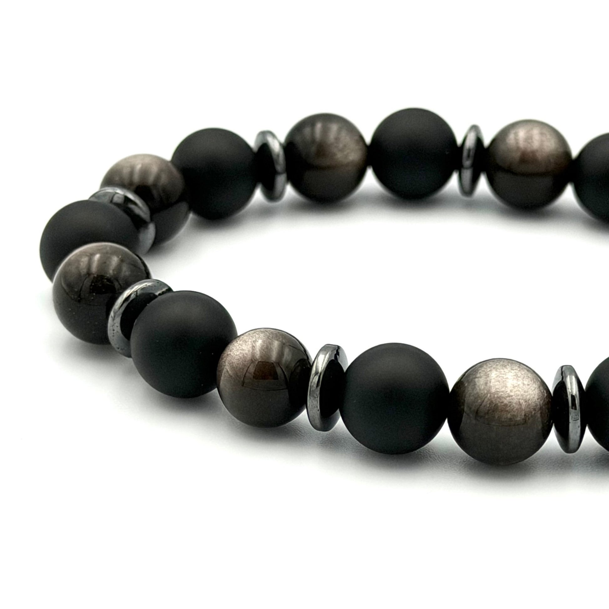 Channel a sleek, confident aesthetic with our Black Onyx & Silver Obsidian Beaded Bracelet — a contemporary natural gemstone bracelet that pairs deep matte onyx with the subtle metallic sheen of Silver Obsidian. Available in 8mm or 10mm bead sizes, the bracelet is finished with coordinating onyx spacer accents that enhance its refined monochrome look. Often associated with grounding, clarity, and inner strength, this unisex bracelet blends modern minimalist design with a bold yet understated presence, making it a versatile piece for both everyday wear and elevated styling.