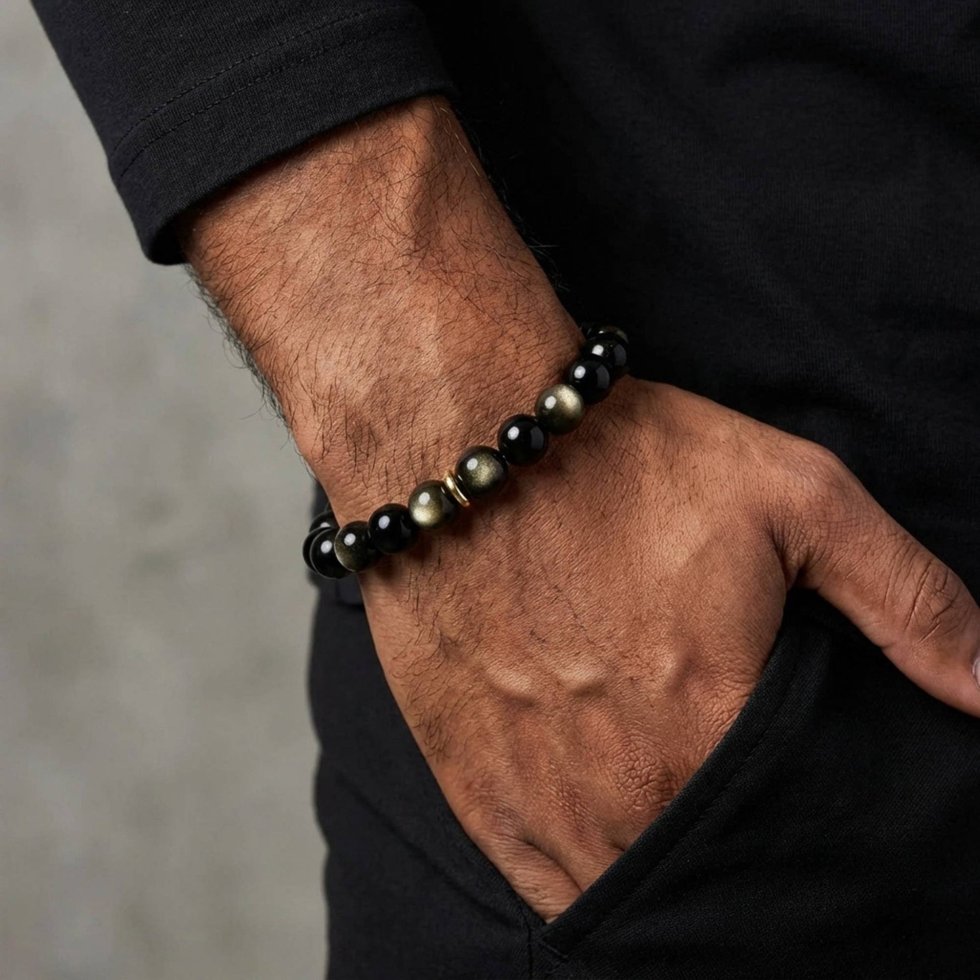 Command a sleek and modern presence with our Triple Obsidian Beaded Bracelet — a premium natural gemstone bracelet featuring a refined blend of Silver Obsidian, Gold Obsidian, and Black Obsidian in rich, dark tones. Offered in 8mm or 10mm bead options, the design is finished with 18K gold-filled spacer accents that introduce a subtle yet striking contrast against the deep, glossy sheen of the stones. Created as a unisex obsidian bracelet for both men and women, it reflects a grounding, protective energy often associated with stability, focus, and inner strength — making it a powerful statement piece with elevated craftsmanship and lasting style.
